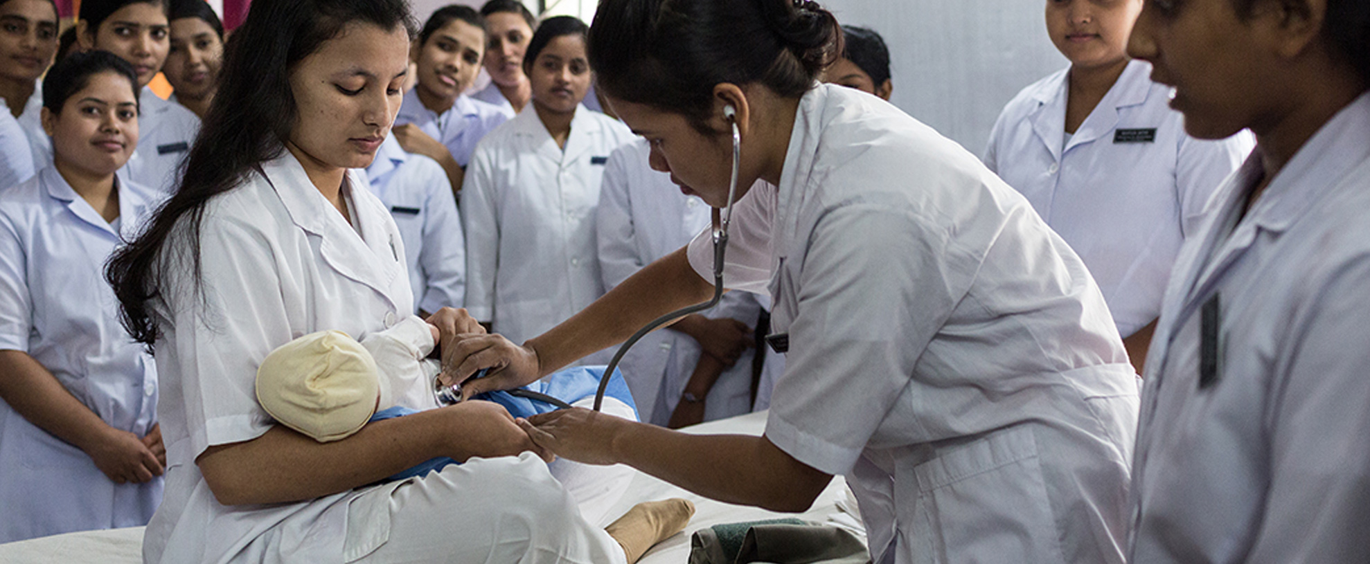 تقوم سيلينا أكتر، الطالبة في السنة الثانية في مدرسة القبالة، بدور الأم في إطار التمرين على الرعاية في مرحلة ما بعد الولادة في معهد التمريض في دينابور ببنغلاديش.
